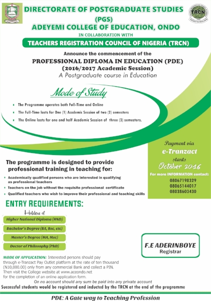 The Directorate of Postgraduate Studies (PGS) of Adeyemi College of Education (ACE), Ondo, in collaboration with Teachers Registration Council of Nigeria (TRCN), announce the commencement of Professional Diploma in Education (PDS) for the 2016/2017 academic session.