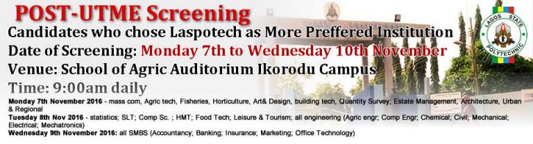 This is to inform all the candidates that applied for the Lagos State Polytechnic (LASPOTECH) admission screening exercise for the 2016/2017 academic session that the management of the institution has released the timetable for the exercise as follows: