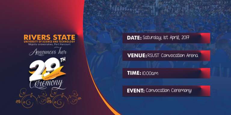 The Management of the Rivers State University of Science and Technology (RSUST) invites the Public, Parents, Guardians and in particular Graduands to the 29th Convocation Ceremonies of the Institution for the conferment of Higher and Bachelors’ Degrees, Emeritus Professors and award of Postgraduate Diplomas and Prizes to deserving graduands.